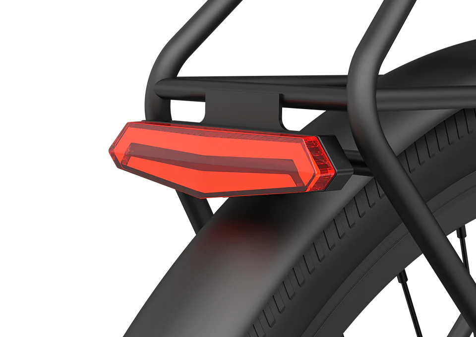 Die integrierten hinteren Blinklichter machen das Signalisieren einfach und erhöhen die Sicherheit bei jeder Fahrt. Aluminium-Schutzbleche bieten zusätzlichen Schutz und sorgen für mehr Komfort, selbst bei schlechten Wetterbedingungen. Zudem verfügt das E-Bike über einen einzigartigen Batterie-Diebstahlschutz und ein stabiles Rahmendesign.